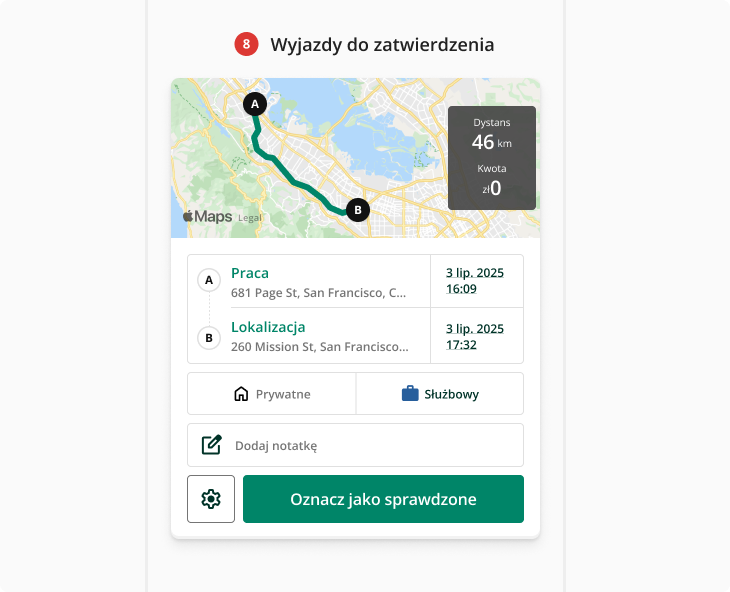 Przeglądaj i zatwierdzaj raporty przebiegu w ciągu kilku minut, płynnie dokonując zwrotów kosztów i oszczędzając godziny papierkowej roboty.